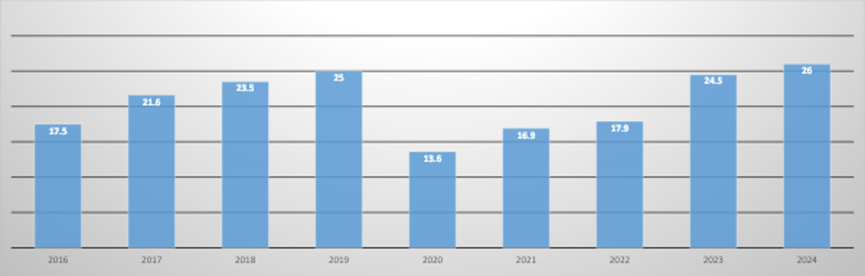 Учитывая темпы роста в первой половине 2025 года (+10% к 2024), общий турпоток за 2025г, вероятно, превысит рекордные показатели 2024 года (26 млн туристов).