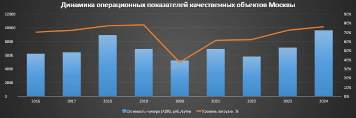 По итогам 2024г рынок гостиничной недвижимости Москвы догнал по уровню загрузки показатель до ковидного 2018г и превысил его по показателю ADR.