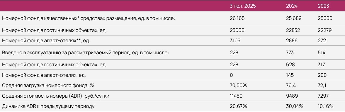 По итогам 3 квартала 2025г средний ADR составляет 11 500р, средняя загрузка аналогична 2024г. Качественные средства размещения – гостиницы и апарт-отели современного формата категории 3–5.